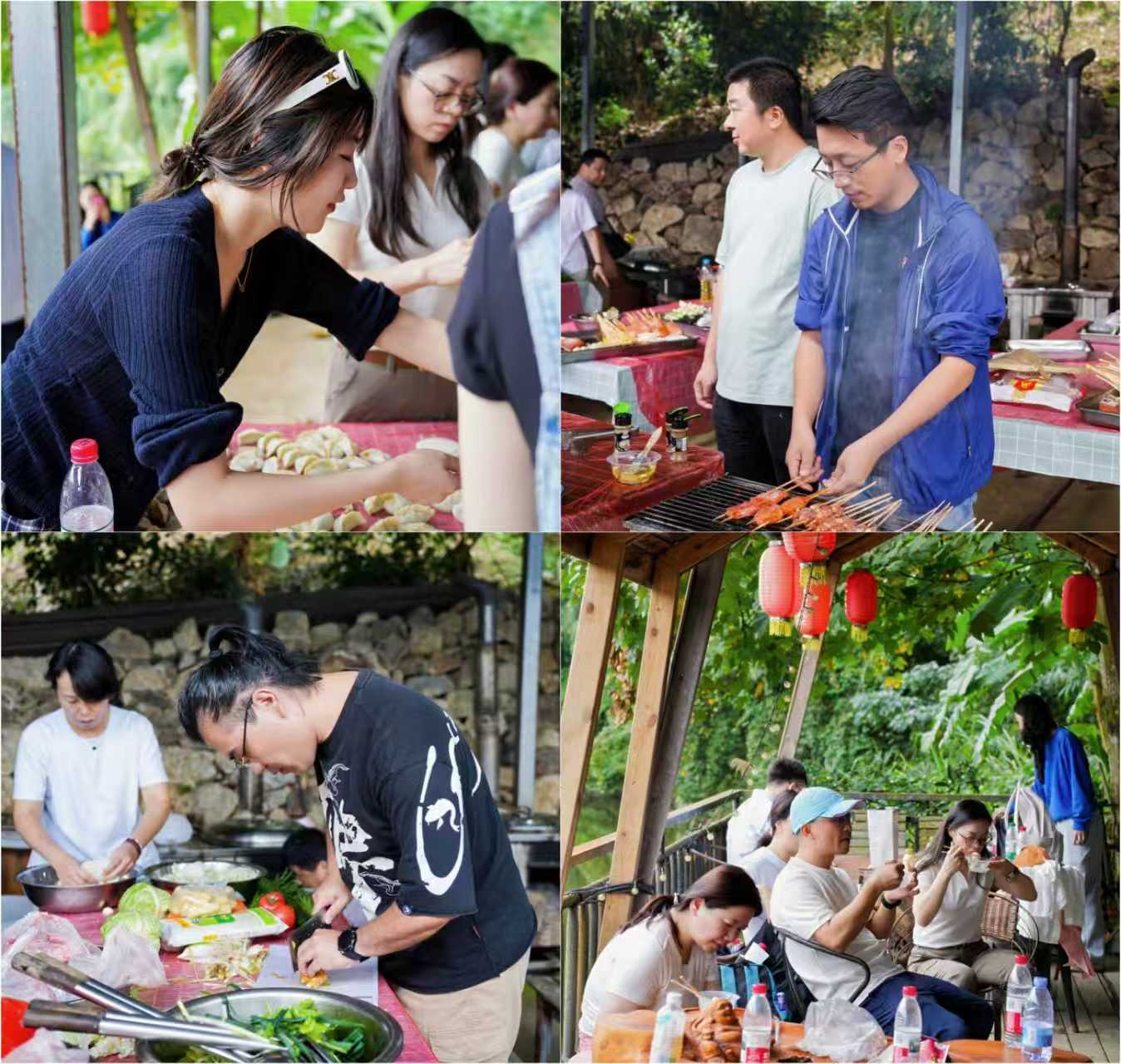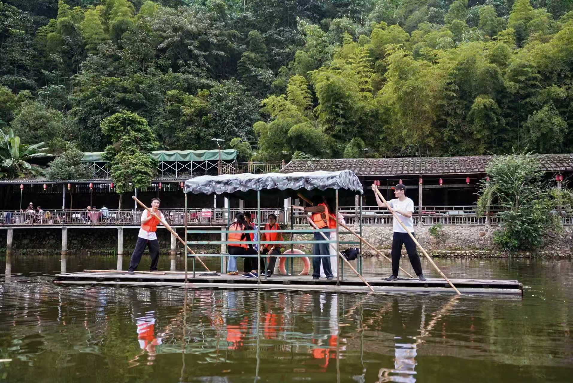 临近中午,大家根据提前准备好的新鲜食材,分工协作、各展所长,将食材烹制成一道道色香味俱全的菜肴。大家围坐在一起,一边品尝着美食,一边畅聊工作和生活中的趣事。待中午短暂休整后,大家分别体验了划竹排、k歌等项目。